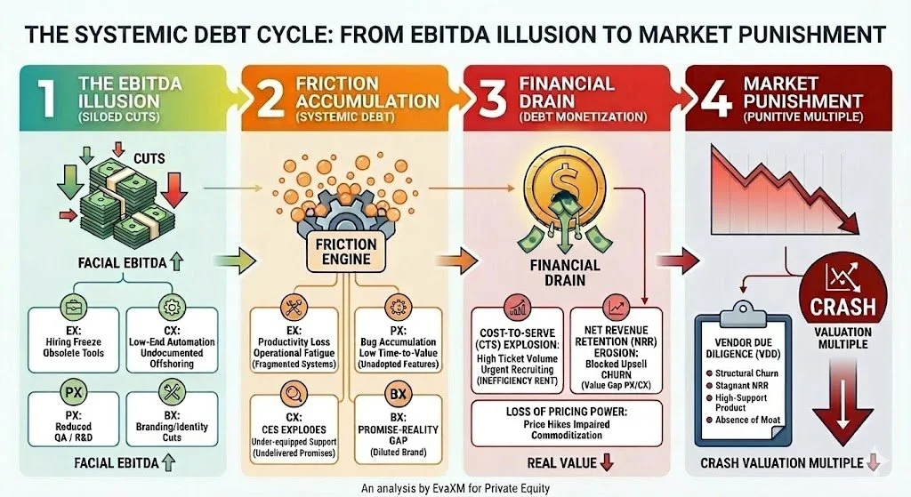 À l'instar de la "dette technique" dans le développement logiciel, la Dette d'Expérience est un emprunt toxique sur la valorisation future de l'entreprise : elle gonfle artificiellement l'EBITDA à l'instant T par des économies en silos, mais crée une friction systémique dont le coût de réparation (les intérêts de la dette) finira par amputer le multiple de sortie lors de la cession.